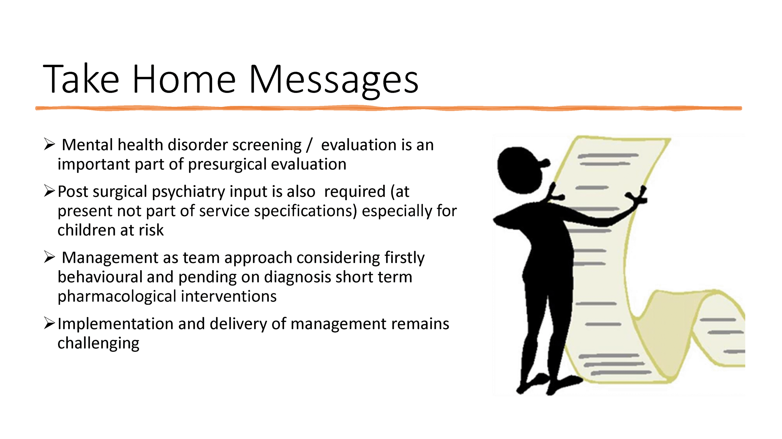- Neuropsychiatry assessment of mood of family, expectations for surgery, mood, may ask local CAHMS for involvement to support further diagnosis assessment of ASD, ADHD